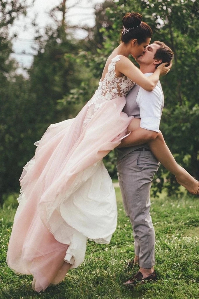 Sheer Neck Tulle Pink Wedding Dresses with White 3D Lace Appliques