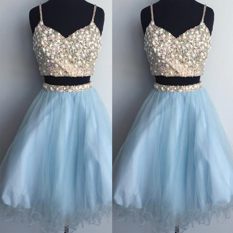 Baby Blue Two PiecesHomecoming Dress, Beadings Tulle Homecoming Dress
