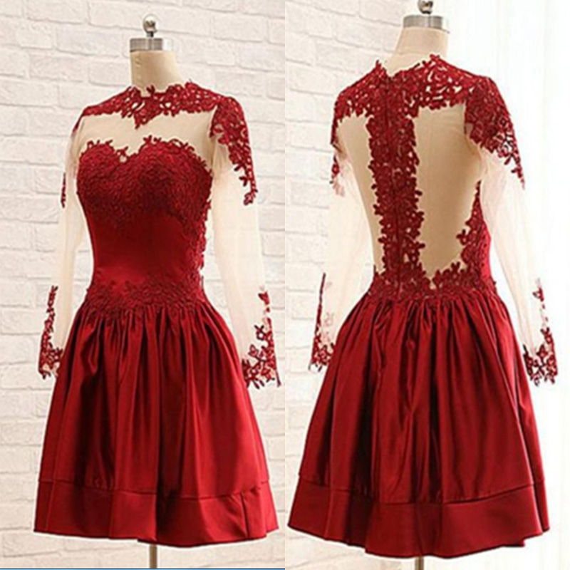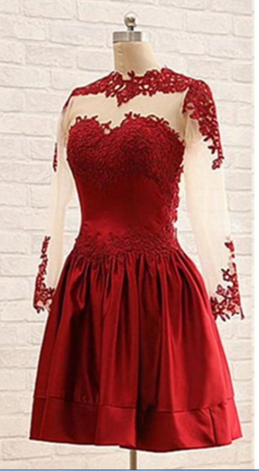 Burgundy Long Sleeves Lace Short Handmade Homecoming Dresses, Short Prom Dresses, Burgundy Homecoming Dresses