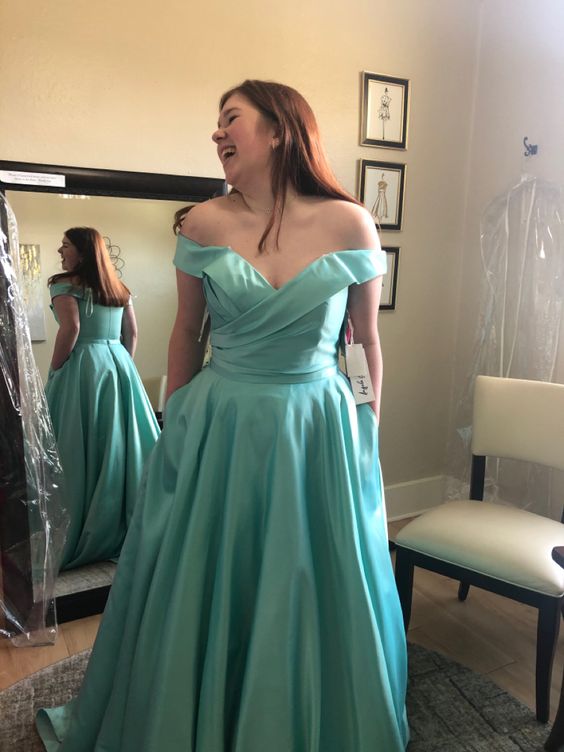 Off-shoulder Long Satin Prom Dresses with Pockets