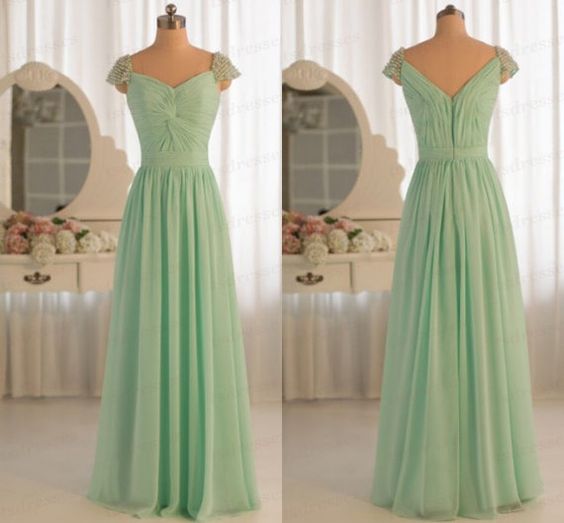 Long Chiffon Mint Bridesmaid Dresses with Beaded Sleeves