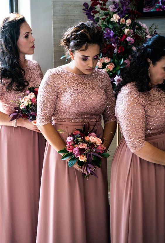 Lace Chiffon Dusty Pink Bridesmaid Dresses with Crystals Beading