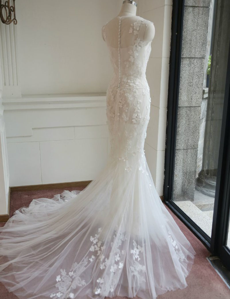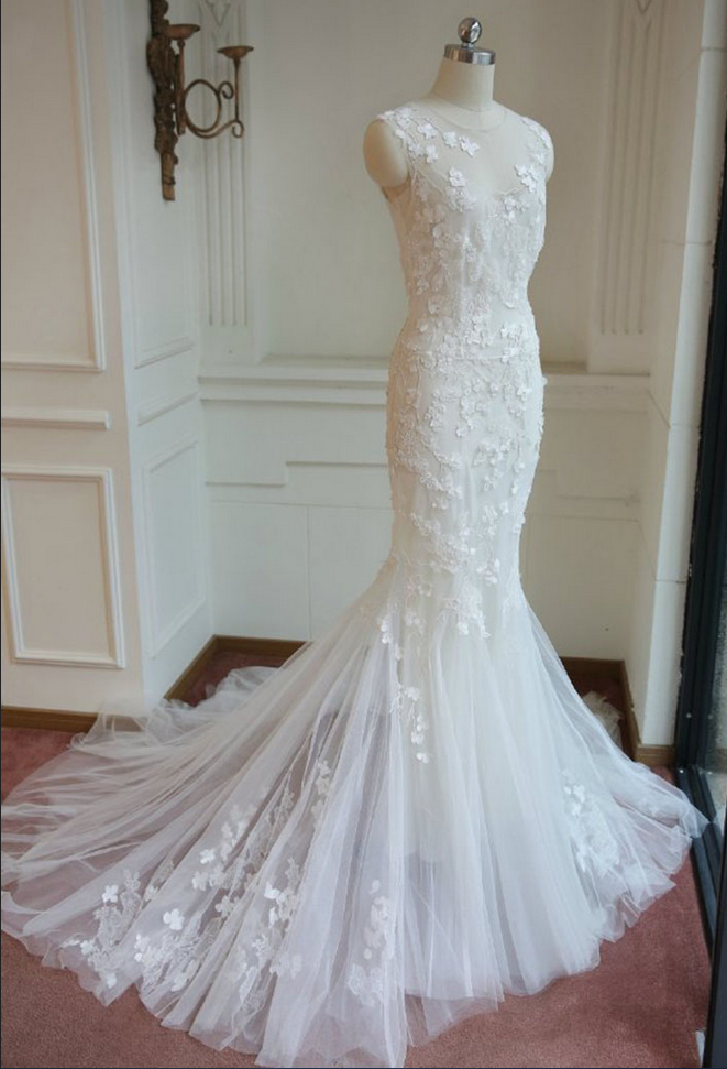Mermaid Lace Wedding Dress.Sleeveless Applique Wedding Dress Plus Size,Ivory Wedding Dress