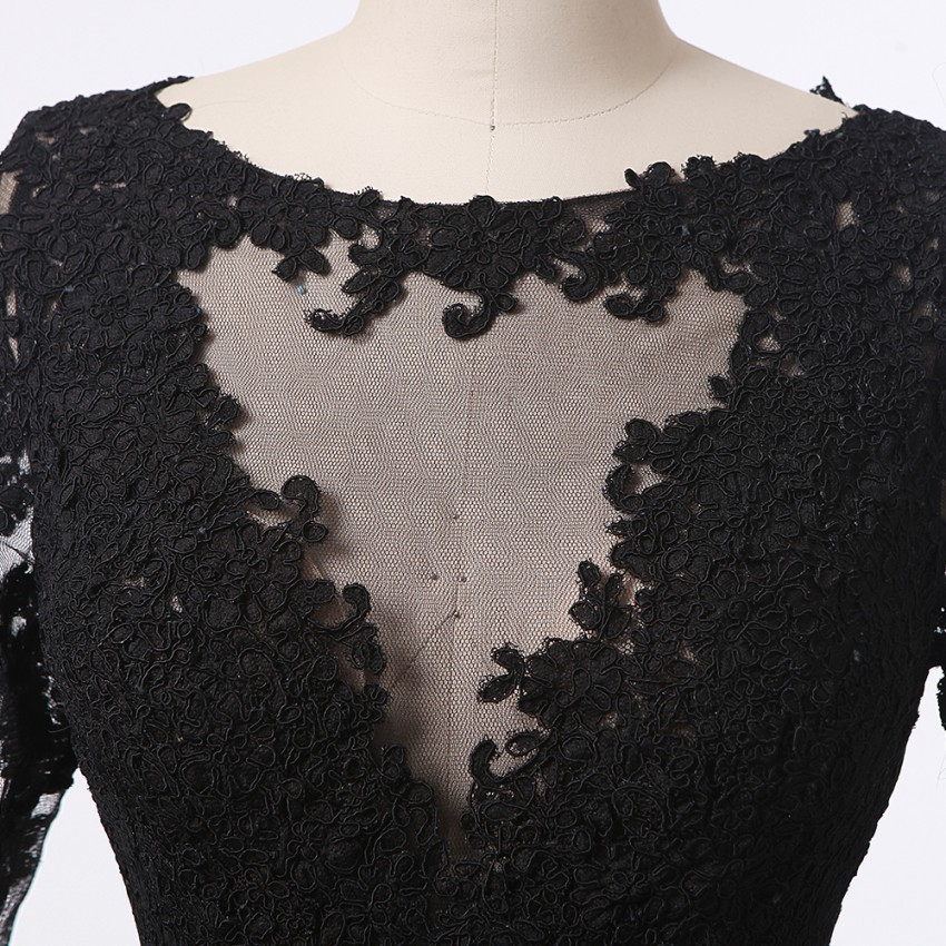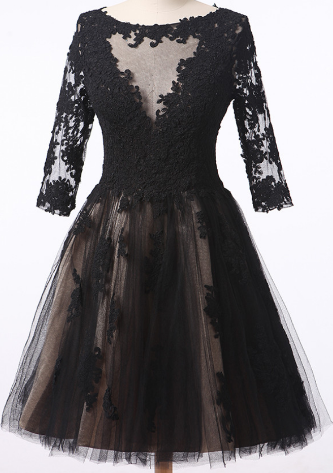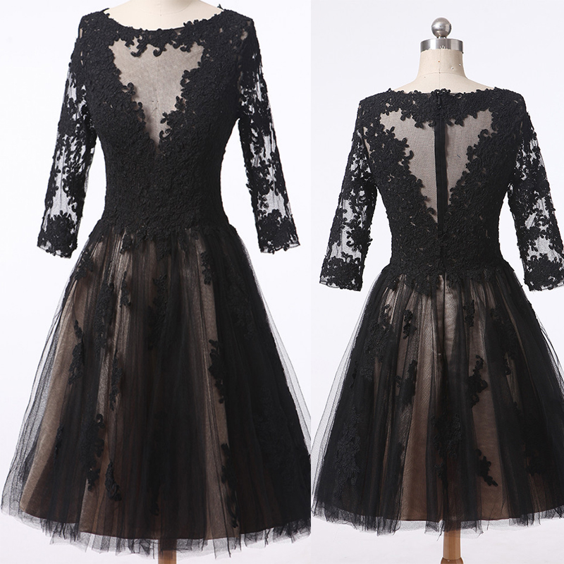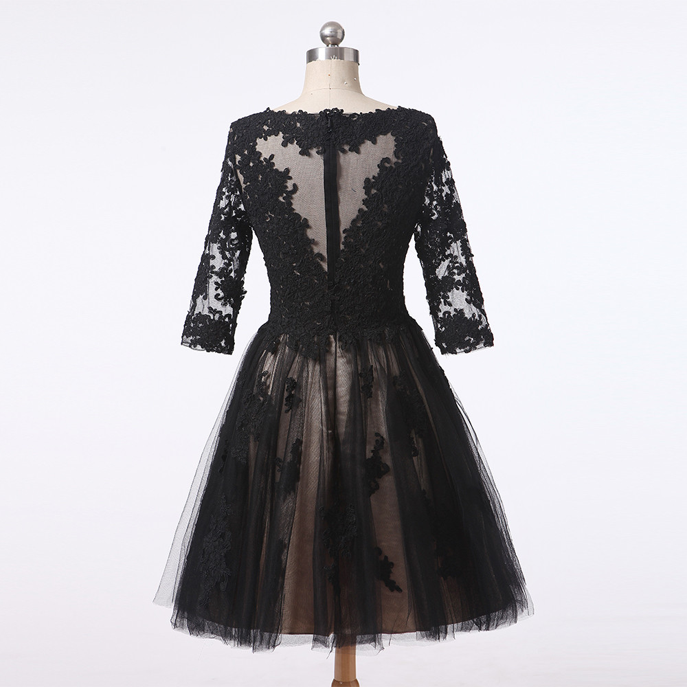 Black Scoop Neck Homecoming Dress Half Sleeves Knee Length Zip Back Graduation Prom Dress Lace Appliques Women Formal Party Gowns
