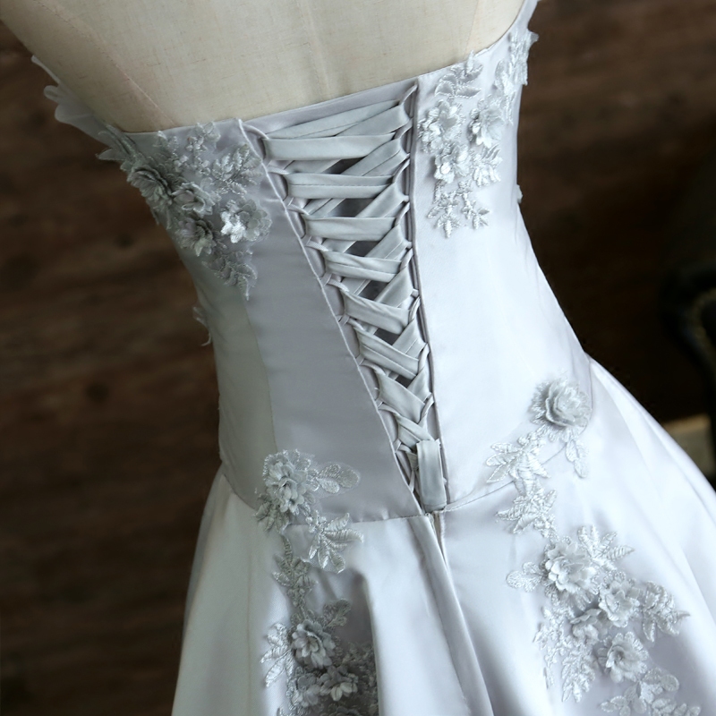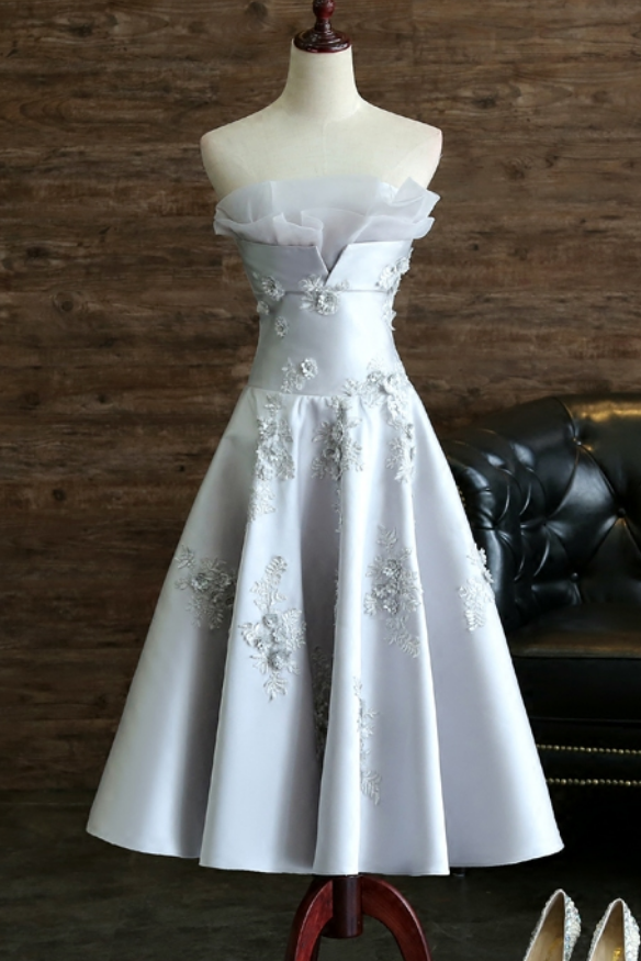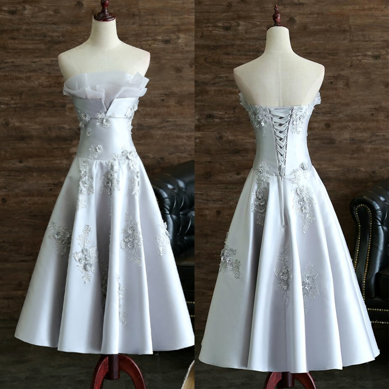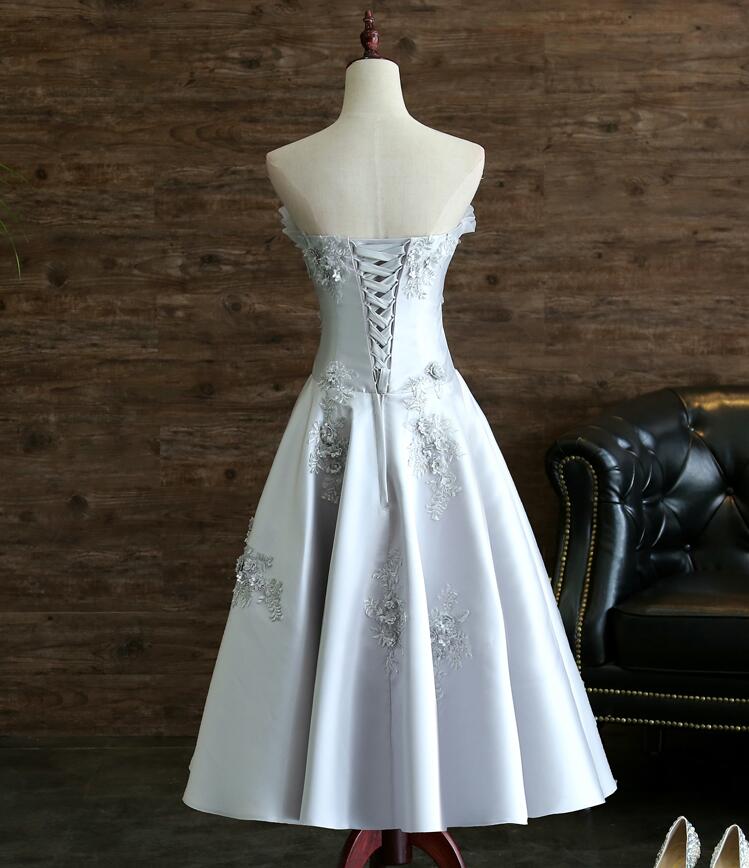 Tea Length Satin A-Line Evening Dress, Silver Prom Dresses, Wedding Party Dresses, Girls Special Occasion Dresses, Formal Dresses for Juniors
