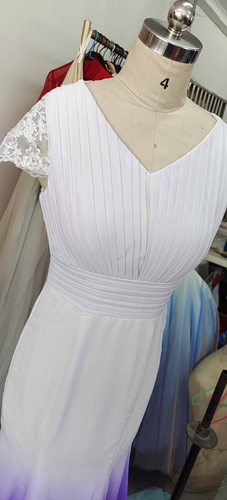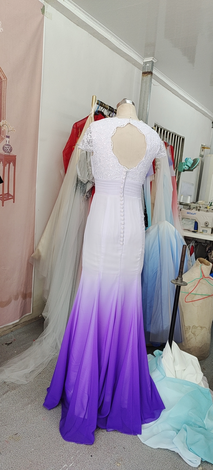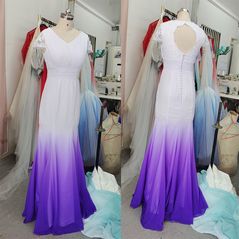 Real Photos White and Purple Wedding Dresses, Ombre mermaid Chiffon Purple Beach Wedding Dresses Ruched Lace Accents Bridal Gowns, Boho Wedding Gowns