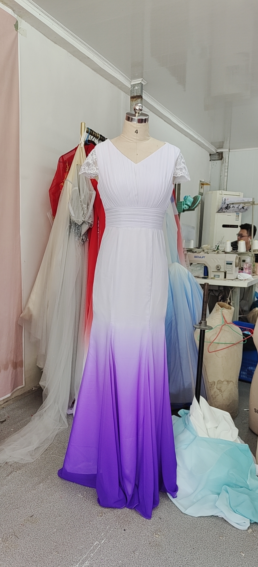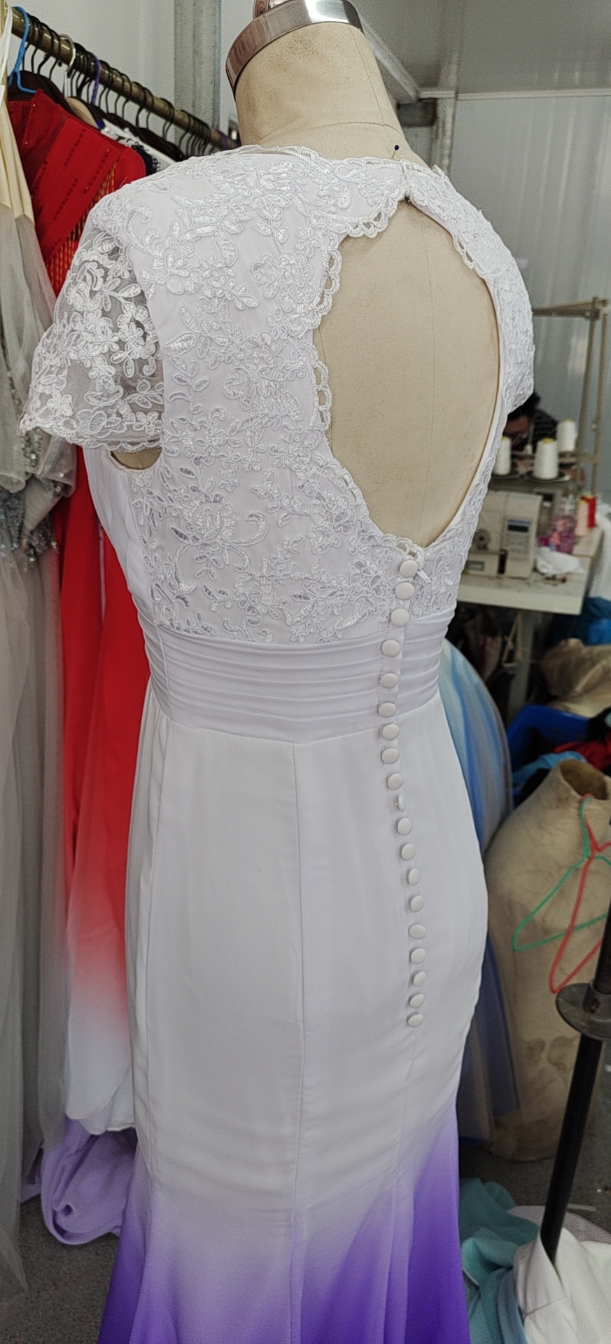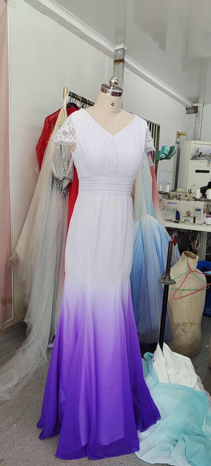 Real Photos White and Purple Wedding Dresses, Ombre mermaid Chiffon Purple Beach Wedding Dresses Ruched Lace Accents Bridal Gowns, Boho Wedding Gowns