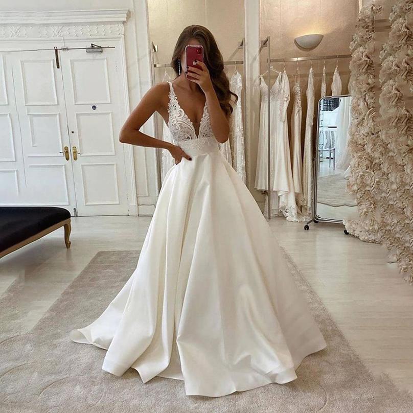 White Lace Satin Wedding Dresses, Ball Gown Wedding Dresses, White Bridal Dresses