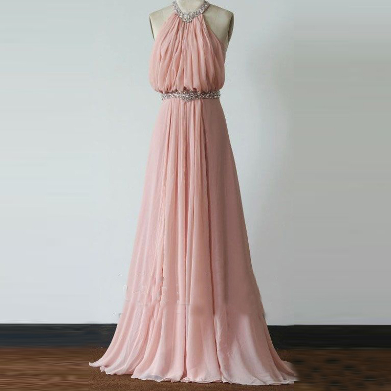 Beaded Halter Pink Chiffon Long Prom Dresses