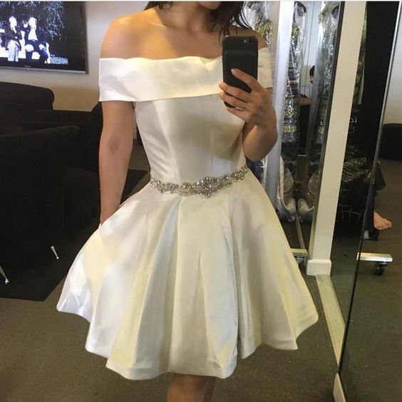 Off-shoulder White Satin Short Homecoming Dresses with Crystals Belt