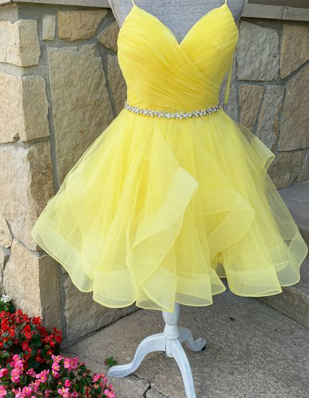 Spaghetti Yellow Short Homecoming Dresses with Crystals Beading