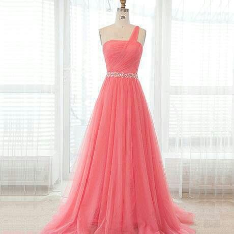 One-shoulder A-Line Tulle Coral Bridesmaid Dresses with Beaded Waist