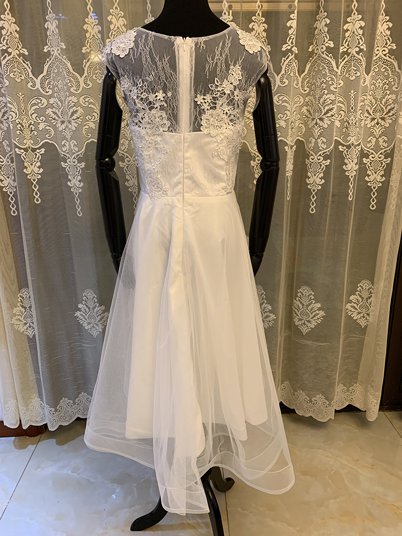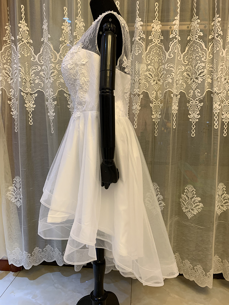 Sleeveless White Tulle High Low Bridal Dresses with Crystals Beaded Lace Appliques