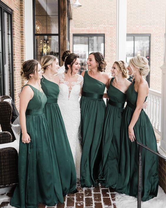 One-shoulder Satin A-Line Emerald Green Bridesmaid Dresses