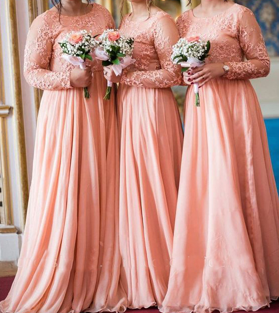 Long Sleeve Lace Chiffon Coral Bridesmaid Dresses