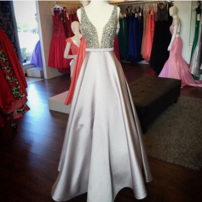 Heavy Beaded V-Neck Gray Prom Dresses with Crystals