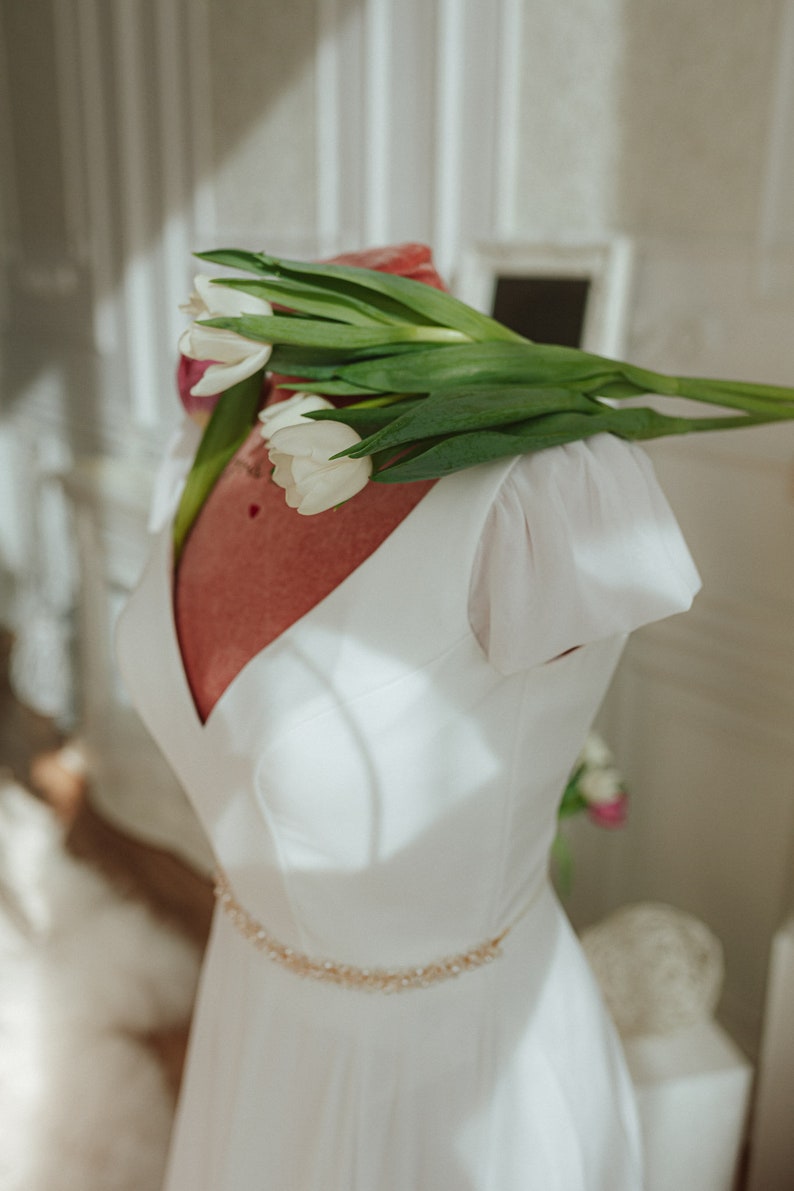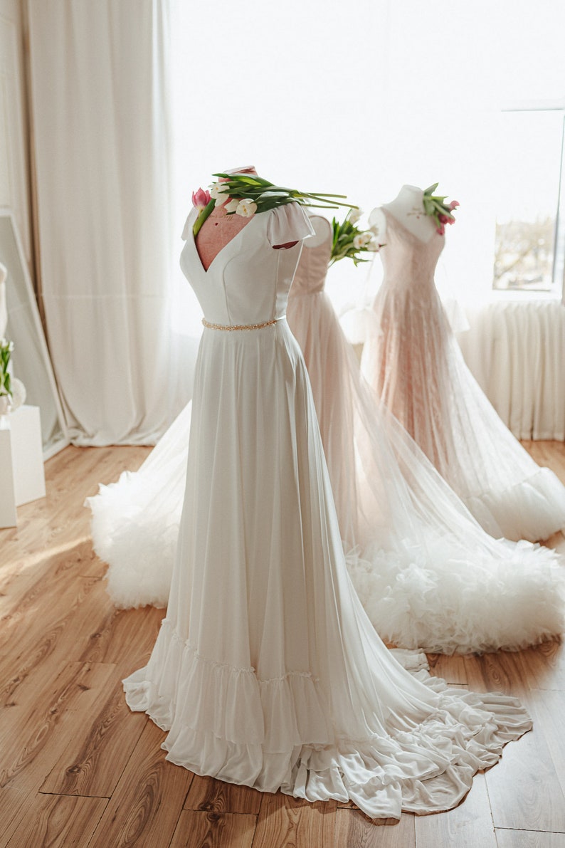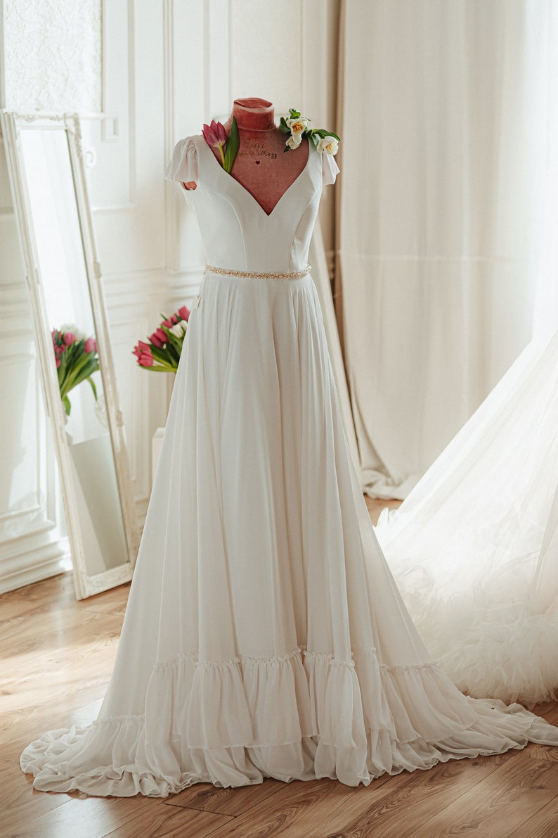 Ivory Satin and Chiffon Boho Wedding Dresses with Beaded Wasit