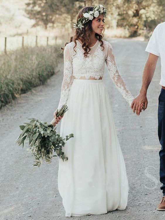 2 Pieces Long Sleeved Lace Chiffon Boho Wedding Dresses
