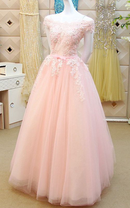 Light Pink Off-the-shoulder Prom Dresses with Beaded Lace Appliques