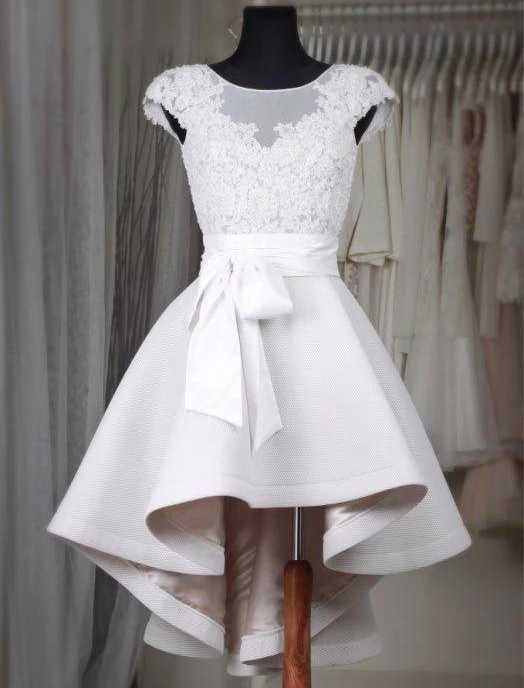 White A-Line Short High Low Bridal Dresses Lace Appliques with Sash