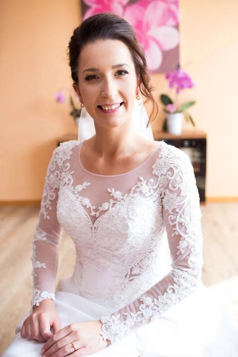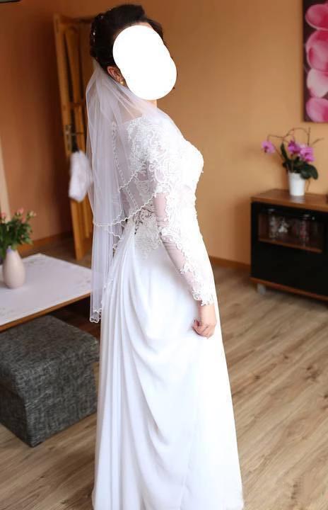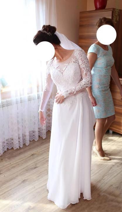 White A-line Chiffon Long Sleeve Wedding Dresses with Pearls Beaded Lace Appliques