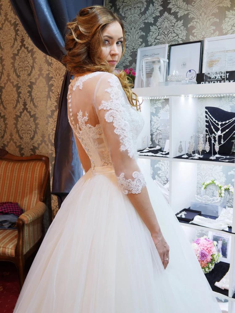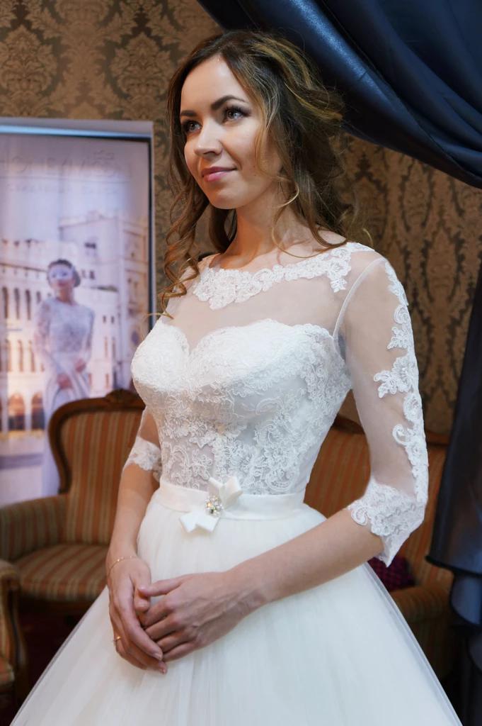 White Tulle 3/4 Sleeve Ball Gown Wedding Dresses with Lace Appliques