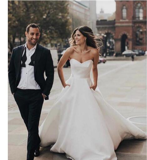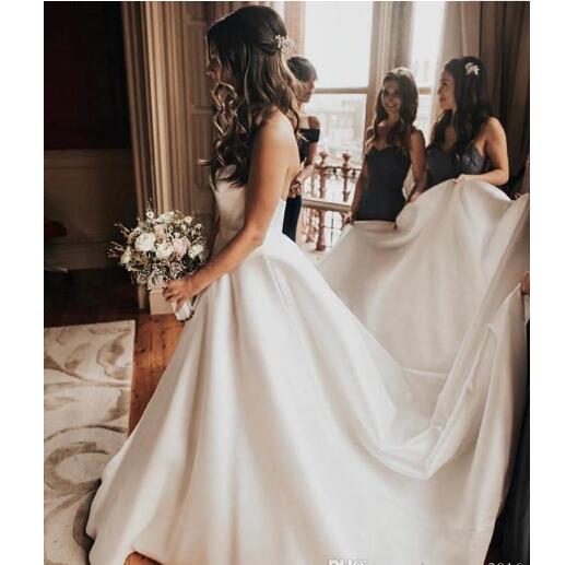 Satin Strapless A-line White Wedding Dresses with Long Train