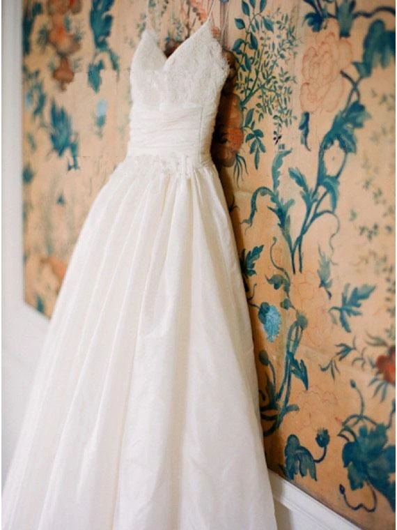 Spaghetti Lace and Satin A-Line White Wedding Dresses