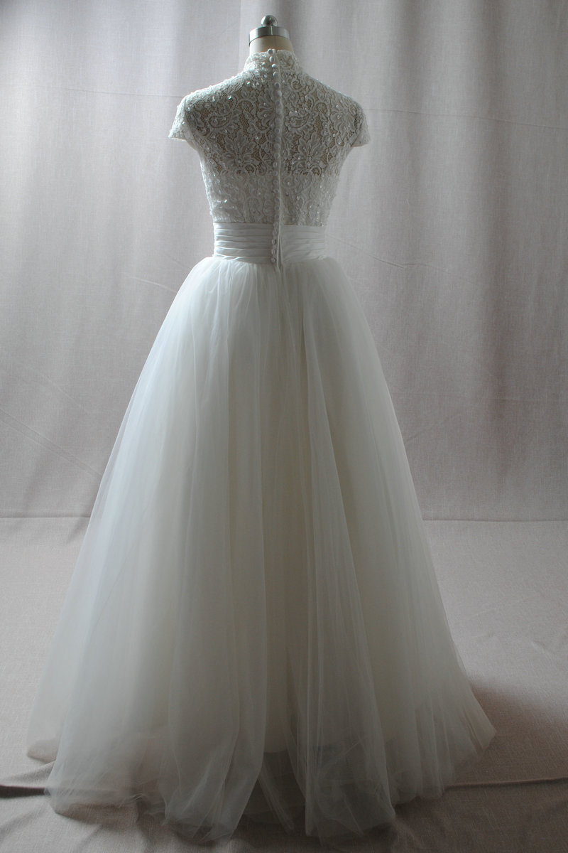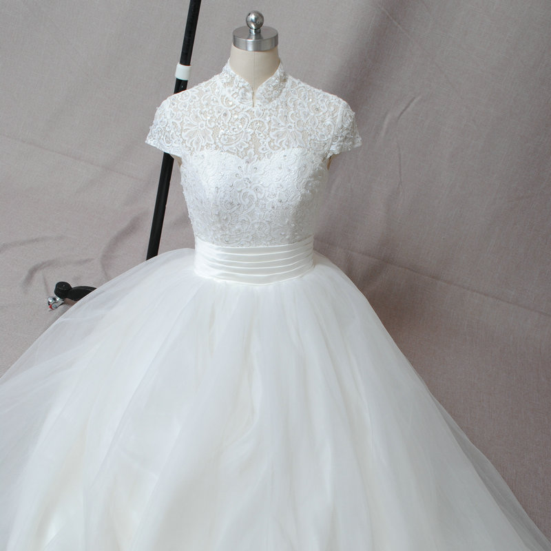 High Neck White Tulle Ball Gown Wedding Dresses with Beading