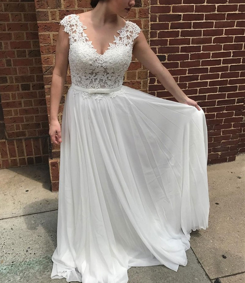 White Lace Chiffon A-Line Wedding Dresses with Appliques