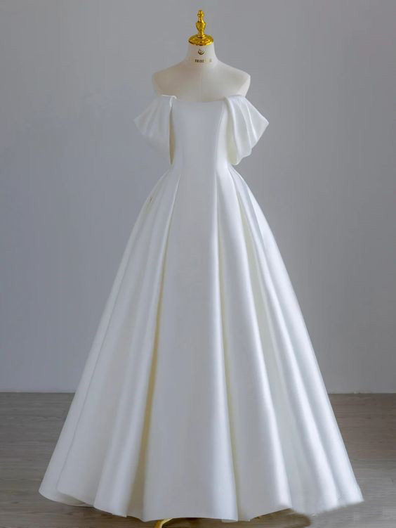 Off-the-shoulder White Satin A-Line Wedding Dresses with Detached Sleeve