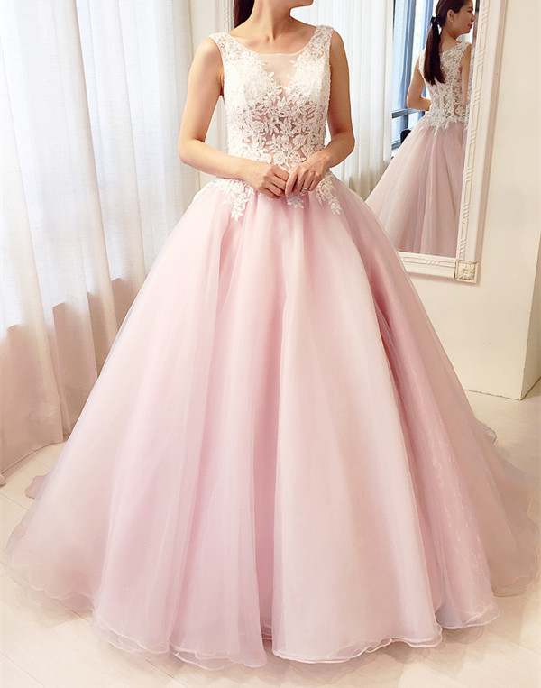 White Lace Pink Ball Gown Wedding Dresses with Appliques