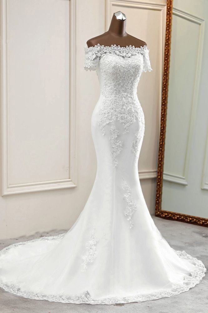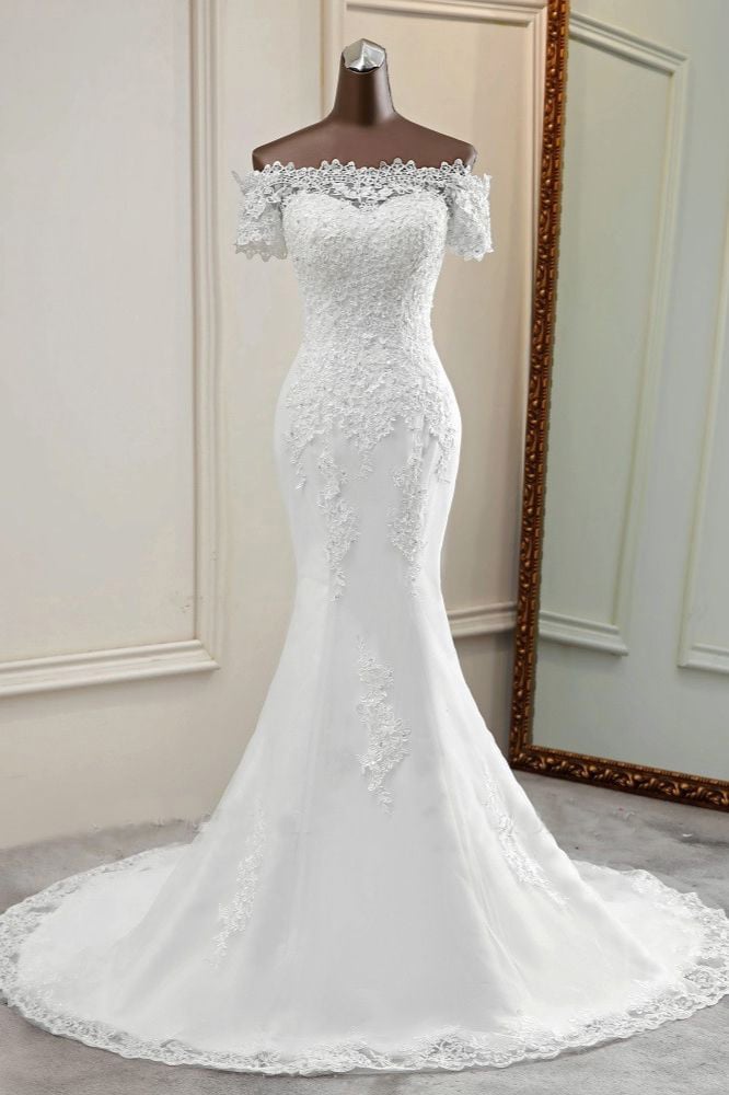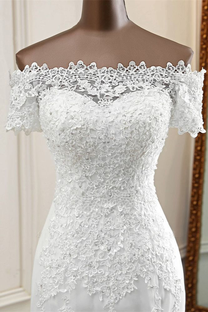 Off-the-Shoulder Lace Mermaid Wedding Dresses Short Sleeves Rhinestones Bridal Gowns