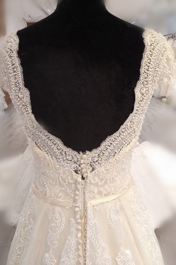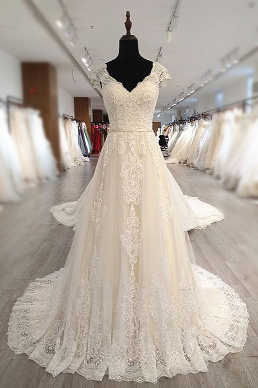 Gorgeous V-Neck Cap Sleeves Tulle Wedding Dress Lace Appliques Ruffle Bridal Gowns Online