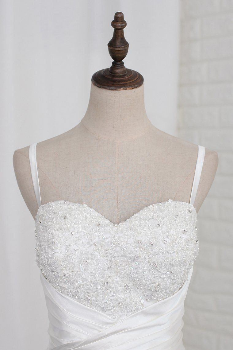 Spaghetti White Satin Mermaid Wedding Dresses with Lace Appliques Beaded Bridal Gowns