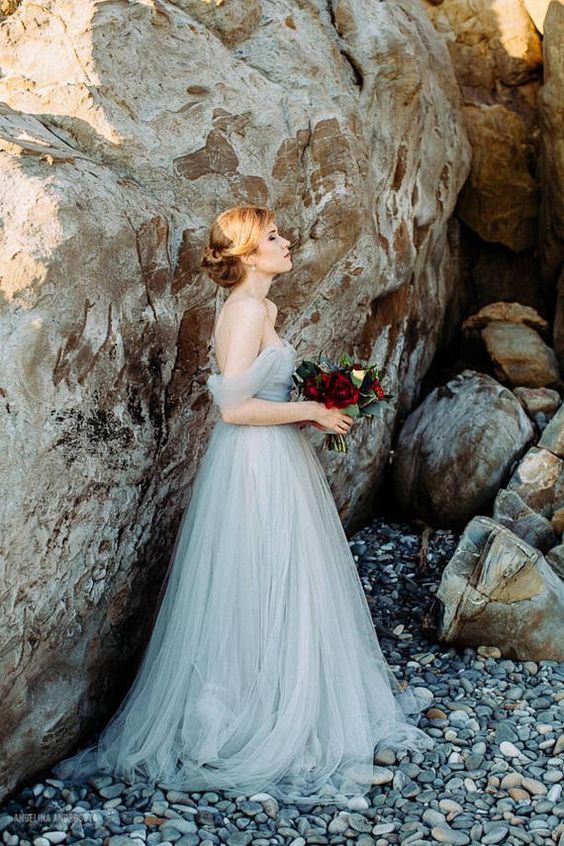 Off-the-shoulder Grey Blue Tulle Wedding Dresses Pleated Colored Bridal Gowns
